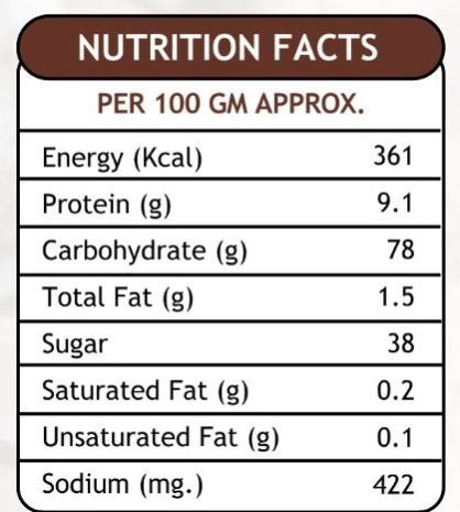 Sugar, Refined, Wheat Flour (Maida) Cocoa Solids, Milk Solids, Vegetable Oil, Maltodextrin, Maize Starch, lodized salt, Raising Agents (INS500(I) (INS541), Emulsifier (INS 471, INS 475), Thickener & Stabilizer (INS415), Natural Food Colour (INS150d) Nature Identical Flavoring Substances Chocolate